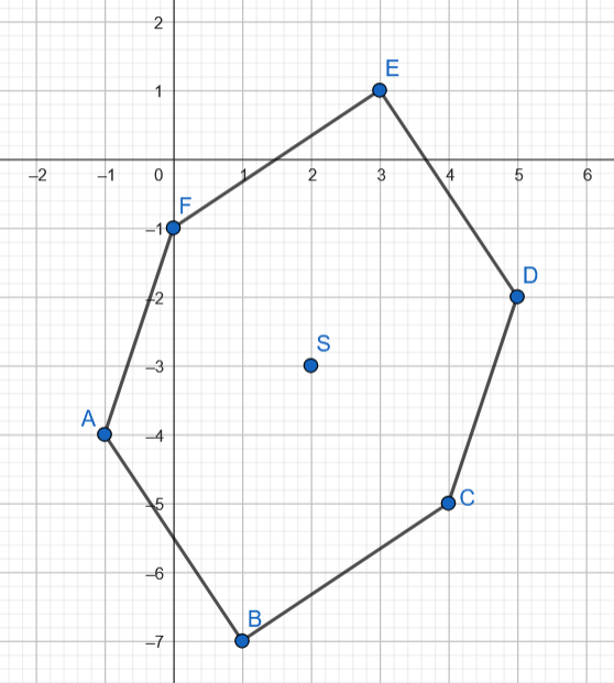 Oblicz obwód tego sześciokąta, jeśli punkt S=(2,-3) jest środkiem symetrii sześciokąta ABCDEF o danych trzech wierzchołkach: A=(-1,-4), C=(4,-5), E=(3,1).