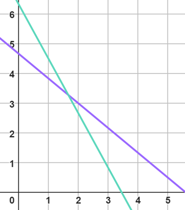 Możemy narysować takie funkcje jako dwie proste prawostronnie skierowane w dół oraz przecinające się w jednym punkcie:
