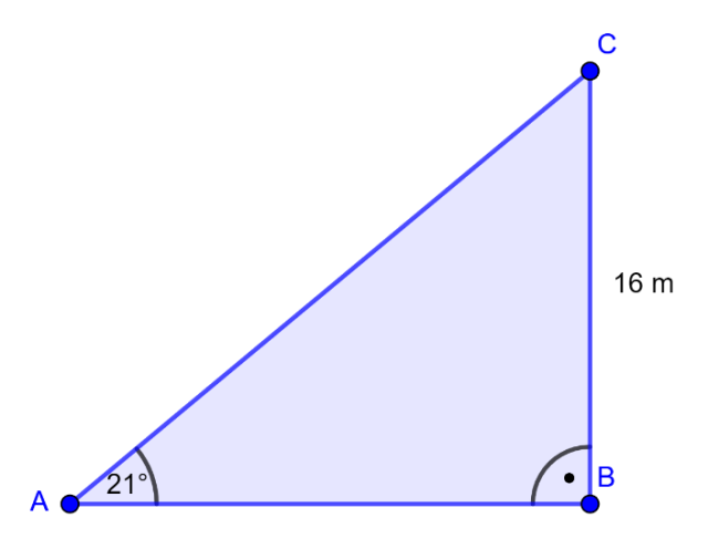 Janek znajduje się na stromym brzegu jeziora, 16 m nad jego poziomem. Zauważył, że łódź płynie po jeziorze, a kąt depresji łodzi (kąt między linią poziomą a linia wzroku Janka skierowaną na łódź) wynosi 21°. Oblicz odległość łodzi od brzegu jeziora.
