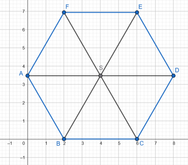 Oblicz współrzędne wierzchołków C, D, E, F, jeśli punkty A, B, C, D, E, F są kolejnymi wierzchołkami sześciokąta foremnego. Wiadomo, że