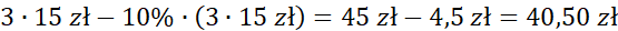 Oblicz cenę trzech biletów, a następnie odejmij od niej 10% zniżkę. Następnie oblicz w ten sam sposób cenę czterech biletów. Na koniec odejmij jedną wartość od drugiej, aby dowiedzieć się, o ile więcej trzeba zapłacić za cztery niż za trzy bilety.