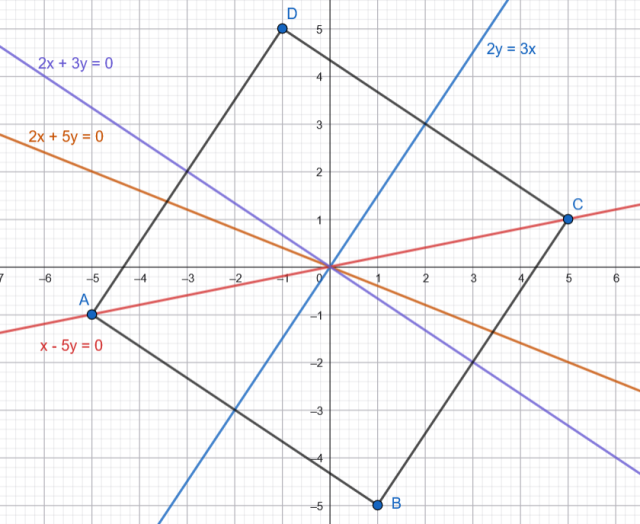 Wyznacz równanie prostej, która nie jest osią symetrii kwadratu o wierzchołkach (-5,-1),(1,-5),(5,1),(-1,5).