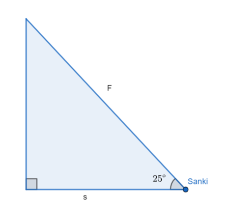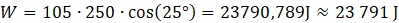 Kasia siedzi na sankach, które są ciągnięte przez jej kolegę Jacka. Jacek działa siłą o wartości F = 105 N. Sanki są w kontakcie z podłożem. Miara kąta α między kierunkiem siły a drogą wynosi 25°. Oblicz pracę W, którą wykona Jacek, jeśli będzie ciągnął sanki na odległość s = 250 m. Podaj wynik z dokładnością do 1 J.