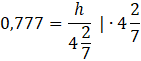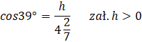 Korzystając z danych podanych w trójkącie na poniższym rysunku, oblicz wartość długości h z dokładnością do 0,1 cm.