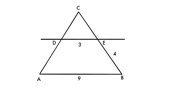 Dany jest trójkąt ABC. Na boku AC zaznaczono punkt D, a na boku AB punkt E. Poprowadzono przez te punkty prostą DE równoległą do AB. |AB| ma miarę 9, |DE| - 3, a |BE| = 4. Oceń, czy podane zdania są prawdziwe.