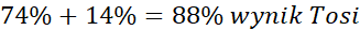Wiedząc, że wynik Tosi jest wyższy o 14 pkt procentowych od wyniku Tomka, obliczono wynik Tosi. Następnie dzięki ułożeniu odpowiedniej proporcji obliczono o ile procent zadań więcej rozwiązała Tosia.