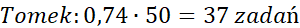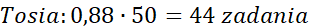 Przemnóż procent zadań, które rozwiązali kolejno Tosia i Tomek przez liczbę wszystkich zadań, czyli 50, aby obliczyć, ile zadań zrobiło każde z nich.