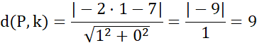 Należy podać odległość punktu P(-2,3) od prostej k: x - 7 = 0.