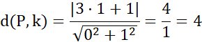 Należy podać odległość punktu P(-2,3) od prostej k: y + 1 = 0.