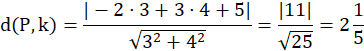 Należy podać odległość punktu P(-2,3) od prostej k: 3x + 4y + 5 = 0.