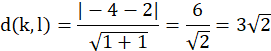 Należy podać odległość między dwiema prostymi równoległymi k: x + y + 2 = 0, l: x + y - 4 = 0.