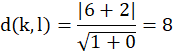 Należy podać odległość między dwiema prostymi równoległymi k: x + 6 = 0, l: 5x - 10 = 0.