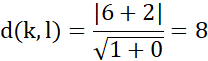 Należy podać odległość między dwiema prostymi równoległymi k: x + 6 = 0, l: 5x - 10 = 0.