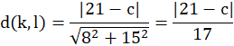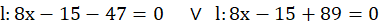 Należy wyznaczyć równanie prostej l, jeżeli jest ona równoległa i odległa o 4 od prostej k: 8x - 15y + 21 = 0.