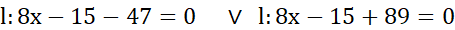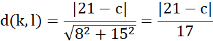 Należy wyznaczyć równanie prostej l, jeżeli jest ona równoległa i odległa o 4 od prostej k: 8x - 15y + 21 = 0.