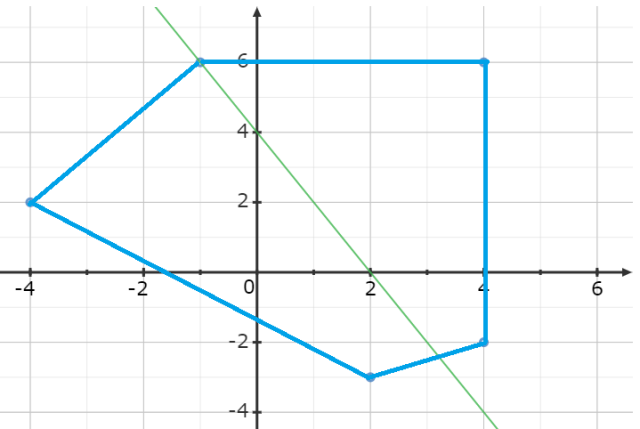 Masz podany pięciokąt o wierzchołkach: 𝐴 = (2, −3), 𝐵 = (4, −2), 𝐶 = (4, 6), 𝐷 = (−1, 6), 𝐸 = (−4, 2). Udowodnij, że prosta o równaniu 𝑦 + 2𝑥 = 4 jest osią symetrii tego wielokąta.