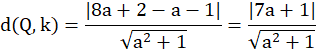 Należy wyznaczyć równanie prostej k zawierającej punkt P(1,-1) i odległej o 5 od punktu Q(8,-2).