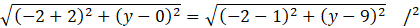 Okrąg jest styczny do osi poziomej w punkcie (-2, 0), zatem jego środek ma współrzędne (-2, y). Dodatkowo odległość tego środka od podanych punktów musi być jednakowa, gdyż jest to promień okręgu.