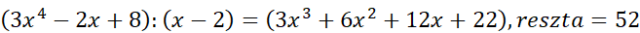 Aby znaleźć szukany wielomian, musisz skorzystać ze schematu Hornera, aby podzielić przez jednomian. Aby skorzystać ze schematu Hornera należy mieć uporządkowany wielomian. Następnie przepisujemy współczynniki wielomianu. Mnożymy wartość pierwszego współczynnika przez miejsce zerowe wielomianu, którego chcemy sprawdzić czy jest dzielnikiem. Powtarzamy czynność, aż skończą się nam wartości współczynników. Jeśli ostatnia wartość w tabeli wynosi 0 to wielomian jest podzielny przez sprawdziany jednomian oraz reszta wynosi zero, jeśli jest coś innego niż zero to wynikiem jest szukana reszta.