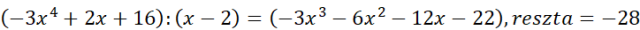 Aby znaleźć szukany wielomian, musisz skorzystać ze schematu Hornera, aby podzielić przez jednomian. Aby skorzystać ze schematu Hornera należy mieć uporządkowany wielomian. Następnie przepisujemy współczynniki wielomianu. Mnożymy wartość pierwszego współczynnika przez miejsce zerowe wielomianu, którego chcemy sprawdzić czy jest dzielnikiem. Powtarzamy czynność, aż skończą się nam wartości współczynników. Resztą jest ostatni wyraz w tabeli.
