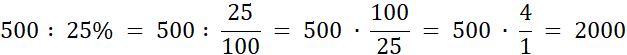 Żeby obliczyć liczbę, jeśli znamy jej procent, najpierw zamieniamy procent na ułamek. Procent to ułamek, który w liczniku ma liczbę procent, a w mianowniku liczbę 100. Następnie dzielimy liczbę przez powstały ułamek. Liczba, której 25% to 500:
