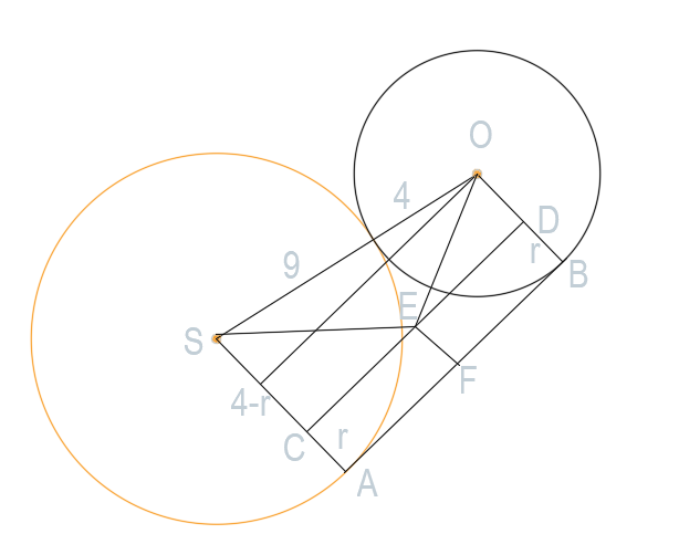 Dane są dwa styczne zewnętrznie okręgi, ich promienie wynoszą odpowiednio 4 i 9. Poprowadzona została prosta styczna do tych okręgów, nieprzechodząca przez punkt styczności okręgów. Podaj promień okręgu, który jest styczny zewnętrznie do obu z tych okręgów i do prostej.