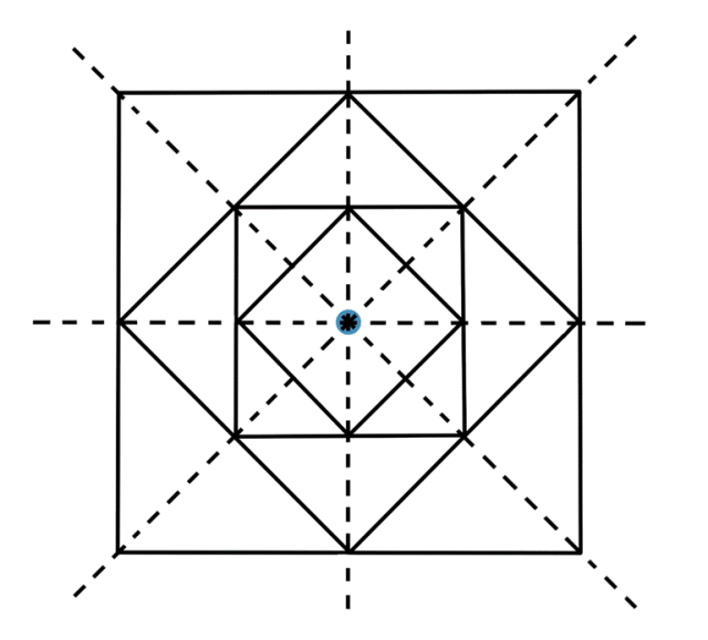 Wykonaj rysunek, łącznie powinny się znaleźć na nim 4 kwadraty. Zaznacz na rysunku 4 osie symetrii oraz środek symetrii – czyli punkt przecięcia osi symetrii.
