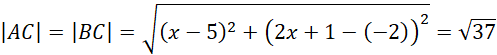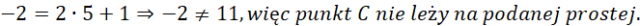 Sprawdź, które z punktów zawierają się w podanej prostej, oblicz długość ramion trójkąta, a następnie wyznacz wartości współrzędnych wierzchołka C.
