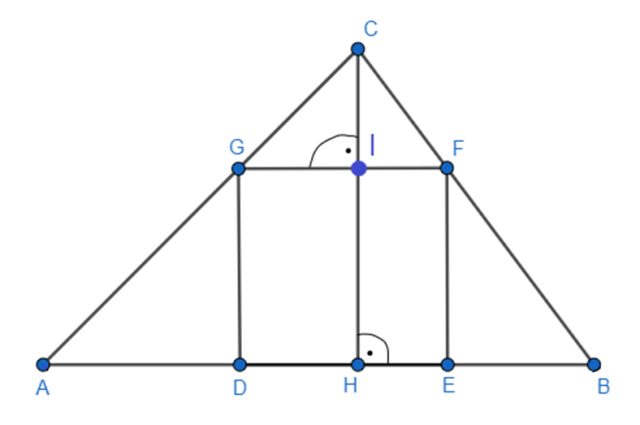 Narysuj rysunek pomocniczy. Znając pole trójkąta, wyznacz długość |CH|. Trójkąty ABC i GFC są podobne z cechy kkk (mają one wspólny kąt przy wierzchołku C oraz dwa takie same kąty). Oblicz długość |GF| z podobieństwa tych trójkątów.