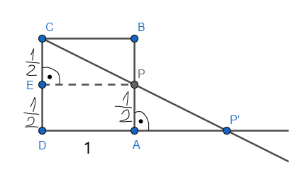 Kwadrat oznaczony jako ABCD na poniższym rysunku ma bok o długości 1. Definiujemy przekształcenie, które przyporządkowuje każdemu punktowi na odcinku AB (z wyjątkiem punktu B) określony punkt na półprostej DA w następujący sposób: Obrazem punktu P jest punkt, w którym półprosta CP przecina półprostą DA. Teraz oznaczmy punkt P' jako obraz punktu P w tym przekształceniu. Jaką długość ma odcinek AP', jeśli |AP| =