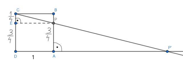 Kwadrat oznaczony jako ABCD na poniższym rysunku ma bok o długości 1. Definiujemy przekształcenie, które przyporządkowuje każdemu punktowi na odcinku AB (z wyjątkiem punktu B) określony punkt na półprostej DA w następujący sposób: Obrazem punktu P jest punkt, w którym półprosta CP przecina półprostą DA. Teraz oznaczmy punkt P' jako obraz punktu P w tym przekształceniu. Jaką długość ma odcinek AP', jeśli |AP| =