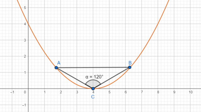 Najpierw zapisz współrzędne punktu C, następnie korzystając z prostej BC wyznacz współrzędne punktu B. Wiedząc, że jest to trójkąt równoramienny, druga współrzędna punktu A będzie taka sama jak punktu B, zatem podstaw do równania paraboli i wyznacz pierwszą współrzędną. Zapisz wszystkie punkty.