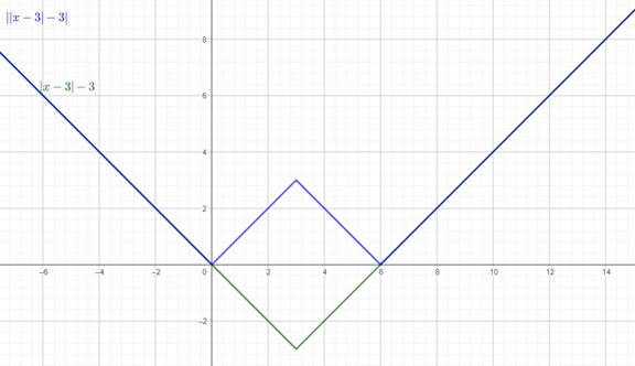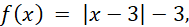W tym podpunkcie pojawia się podwójna wartość bezwzględna, oznacza to, że początkowo rysujemy wykres wartości bezwzględnej przesuniętej o3 jednostki w prawą stronę i o 3 jednostki w dół. Następnie odbijamy wartość znajdującą się pod osią OX.