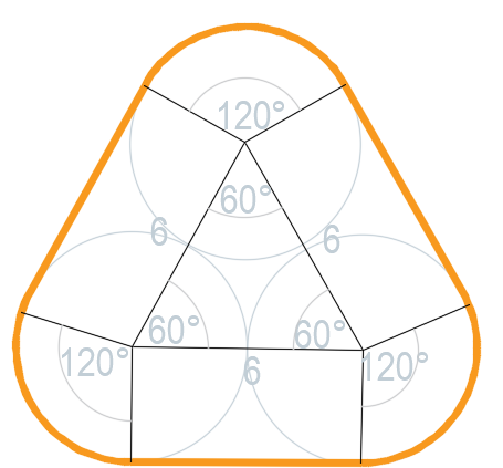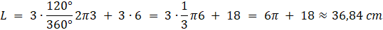 Długość klejenia taśmą składa się z długości trzech łuków o promieniu 3 cm i kącie 120° oraz z trzech długości średnicy jednej puszki.
