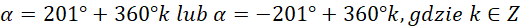 W tym zadaniu musisz powiedzieć, dla jakich xy funkcji y = cos α wynosi tyle samo co dla kąta 201° przy założeniu, że miara kąta α jest większa lub równa –360° oraz mniejsza lub równa 360°.