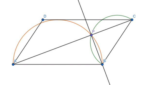 Wewnątrz równoległoboku narysowano dwa półokręgi: średnicą jednego jest krótszy bok, a średnicą drugiego – dłuższy bok równoległoboku. W tym zadaniu musisz wykazać, że punkt przecięcia tych półokręgów różny od wierzchołka równoległoboku należy do jednej z przekątnych tego równoległoboku.