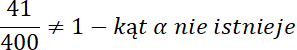 W tym zadaniu skorzystaj z twierdzenia jedynki trygonometrycznej: sin2α + cos2α = 1 i sprawdź, czy wartości sinus i cosinus kąta podniesione do kwadratu będą równe liczbie 1. Otrzymany wynik nie jest równy liczbie 1, więc kąt α nie istnieje.