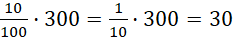10% liczby 300 to dziesiąta część liczby 300, czyli 300 : 10 = 30