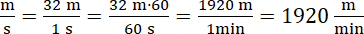 Zauważ, 1 minuta to 60 razy więcej niż 1 sekunda, czyli gdy czas jest 60 razy dłuższy, dystans jest 60 razy większy. Pomnóż przez 60 licznik i mianownik ułamka, wykonaj mnożenie w liczniku, a mianowniku zamień jednostkę czasu.