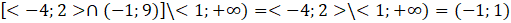 Narysuj oś liczbową. Zaznacz na osi podane przedziały liczbowe. Najpierw wykonaj działanie w nawiasie – wyznacz część wspólną przedziałów liczbowych. Następnie wyznacz różnicę przedziałów liczbowych.