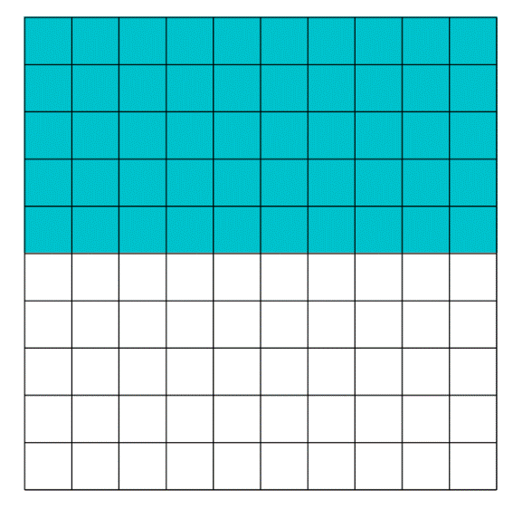 W obu kwadratach należy zamalować taką samą część. 0,5 to tyle samo co 0,50, ponieważ dopisanie zer na końcu ułamka dziesiętnego nie zmienia jego wartości.