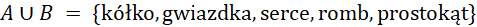 Sumę zbiorów A i B stanowią elementy, które występują w zbiorze A lub w zbiorze B, czyli możesz wziąć elementy, które występują tylko w zbiorze A, tylko w zbiorze B oraz ich część wspólną.