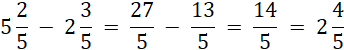 Zamień ułamki na ułamki niewłaściwe, a następnie wykonaj odejmowanie. Gdy odejmujemy dwa ułamki o jednakowych mianownikach, odejmujemy ich liczniki, a mianownik pozostawiamy bez zmian.