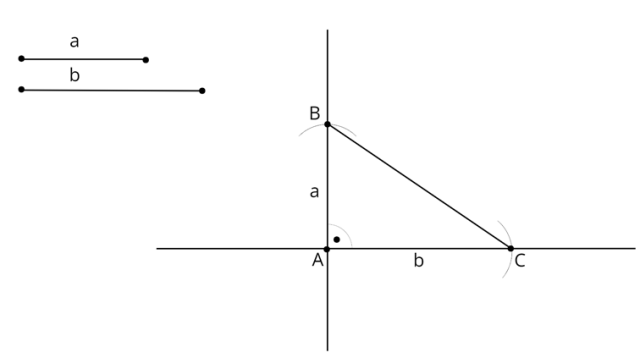 Zacznij od narysowania odcinków a i b oraz dwóch prostych prostopadłych przecinających się w punkcie A. Zmierz za pomocą cyrkla długość odcinka a, a następnie nie zmieniając rozwartości wbij cyrkiel w punkt A i zakreśl łuk na jednej z prostych. Punkt przecięcia łuku i prostej oznacz jako B. Zmierz za pomocą cyrkla długość odcinka b, a następnie nie zmieniając rozwartości wbij cyrkiel w punkt A i zakreśl łuk na drugiej prostej. Punkt przecięcia łuku i prostej oznacz jako C. Po połączeniu punktów A, B i C powstanie szukany trójkąt.