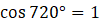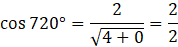Ramię końcowe kąta 720° pokrywa się z dodatnią częścią osi x. Jeśli podstawisz współrzędne dowolnego punktu należącego do tego ramienia (np. P = (2, 0)) do wzoru na cosinus kąta otrzymasz: