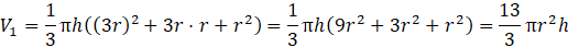 Zamiast wzoru, możesz wyobrazić sobie, że do stożka ściętego przyklejono stożek w taki sposób, że doklejony stożek jest podobny do całego stożka. Wtedy obliczasz objętość tego stożka i objętość całego stożka. Objętość stożka ściętego jest równa różnicy tych dwóch objętości.