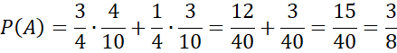 Wyznacz prawdopodobieństwo wylosowania kuli białej, jeśli mamy dwie urny z kulami: w pierwszej jest 10 kul: 4 białe i 6 niebieskich, w drugiej – też 10 kul: 3 białe, 5 żółtych i 2 niebieskie. Rzucamy dwa razy monetą: jeśli przynajmniej raz wypadnie orzeł, to losujemy kulę z pierwszej urny, przeciwnym razie – z drugiej.