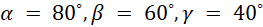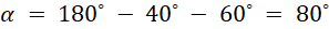 Kąt 60˚ i β są naprzemianległe, kąt 40˚ i γ są kątami wierzchołkowymi, kąty α i |∢C| są naprzemianległe, stąd: