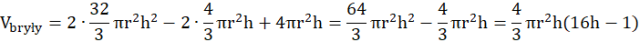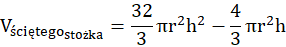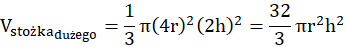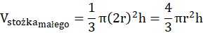 Oblicz objętość stożka dużego oraz małego. Ich różnica będzie objętością bryły – ściętego stożka. Następnie oblicz objętość walca. Suma objętości walca i dwóch ściętych stożków będzie szukaną objętością bryły.