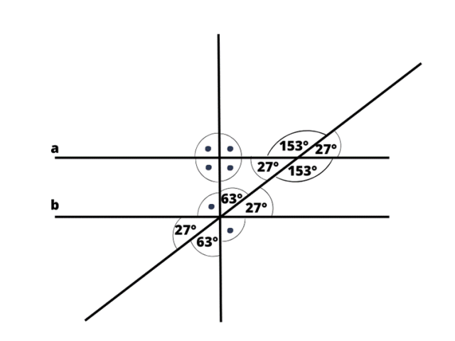 Kąty w trójkącie: 90°, 27° oraz 63°. W miejscu przecięcia odcinka z prostymi kąty mają miarę 90°.